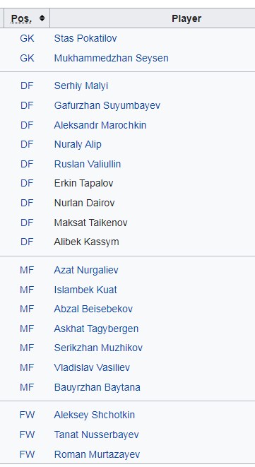Од ово состав најмногу настапи имаат дефанзивецот Сергеј Малји и играчот за врска Азат Нургалиев со 46 односно 43 настапи.