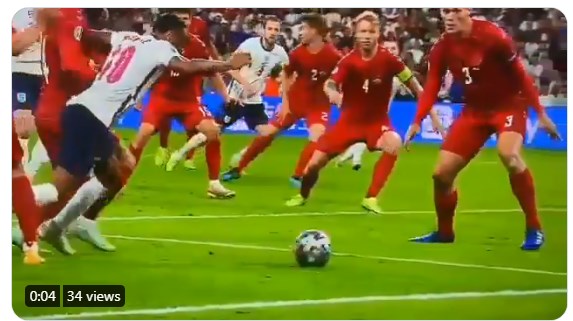 Англија во финишот на првото продолжение поведе со 2:1 против Данска и го отвори патот до своето прво финале во историјата. Се чини пеналот е сомнителен, судијата Дани Макели покажа на белата точка по паѓањето на Рахим Стерлинг во дуел со двајца дански играчи. Макели дури се консултираше со колегите од ВАР собата кои исто така оценија дека имало контакт.
