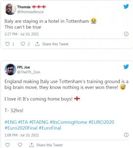 Лавина од воодушевување во Англија предизвика информацијата дека Италија, противникот на „Гордиот Албион“ во утрешното финале од ЕУРО, тренира во тренинг центарот на премиерлигашот Тотенхем.