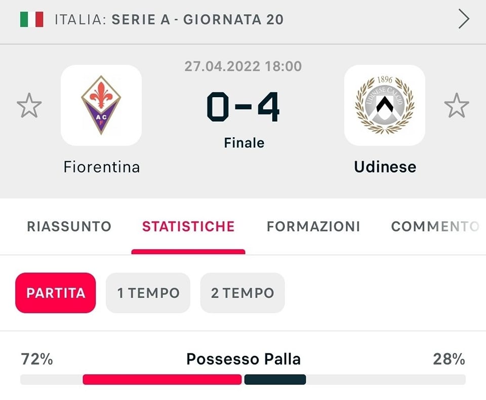 Нестор на терен, Удинезе со 28% посед на топка со 4:0 ја победи Фиорентина