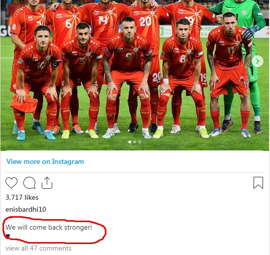 Македонија претрпе убедлив пораз од Грузија со 0:3 и тоа во Скопје. Капитенот Енис Барди почувствува одговорност да одговори на јавноста која е разочарана по катастрофалниот пораз од Грузијците пред се од лошата игра во нападот. Барди испрати порака која ќе влее надеж за во иднина.