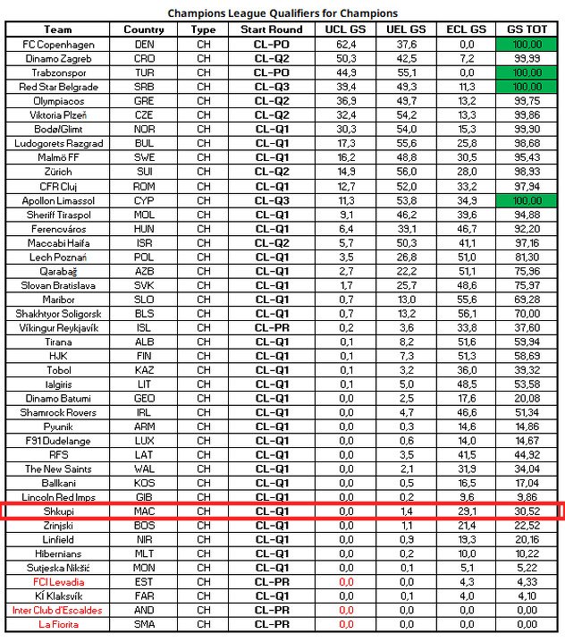 Интересно, дури четири шампиони имаат 100 отсто шанси за пласман во некоја групна фаза преку квалификациите. Тоа се Копенхаген, Трабзон, Црвена Звезда и Аполон. А Динамо Загреб котира високо со 99,99 отсто.