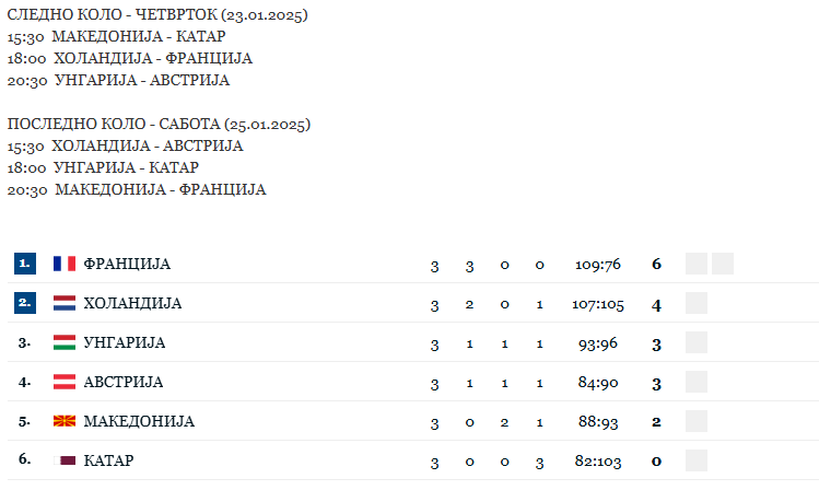 И двете репрезентации одиграа драматичен меч на отварањето на главната рунда, со тоа што Македонија освои бод против Австрија со голот на Филип Кузмановски во последната секунда, додека пак Катар со звкукот на сирената прими гол за пораз од Холандија.