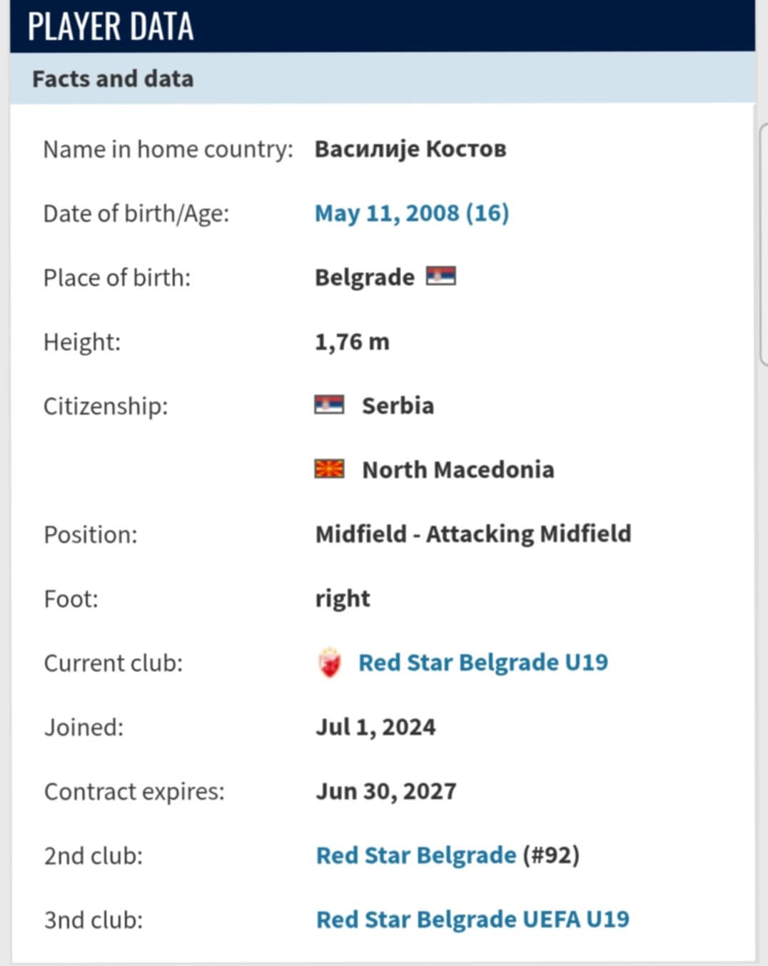 Костов е проектот на Звезда кој следно ќе биде лансиран како прва „виолина“ во составот на Владан Милојевиќ и само небото е граница за неговите фудбалски можности. Момчето родено 2008 година во Белград има само шеснаесет години веќе има петнаесетина настапи за младинските селекции за Србија, но интересно е што има македонско потекло. И поседува пасош на Македонија.