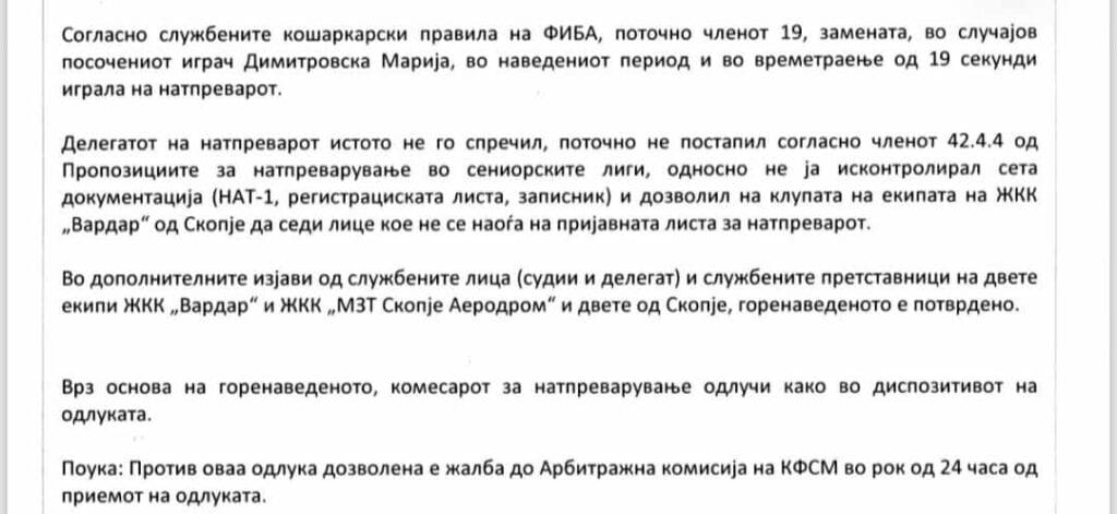 Покрај Вардар, казна има и за делегатот на мечот Миа Божиновска која доби забрана за вршење на должност од четири меча во сите младински и сениорски лиги.