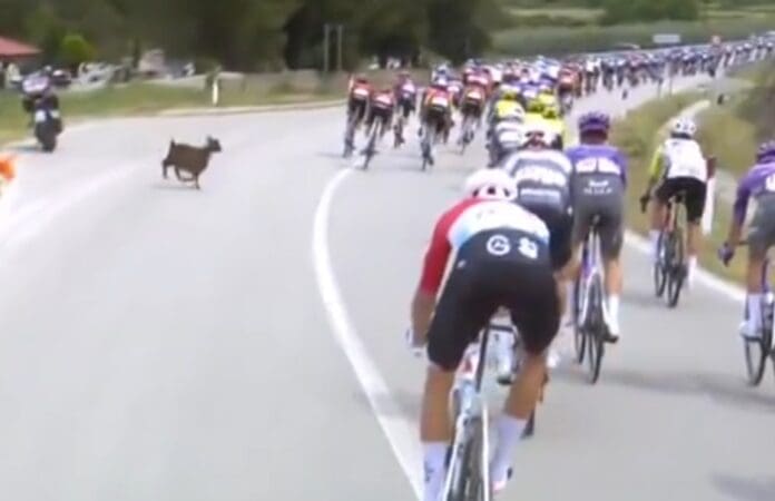 Новозеландскиот велосипедист Дион Смит преживеа судир со заскитана коза пред да ја заврши третата етапа на една од најпрестижните велосипедски трки, Џиро д’Италија.