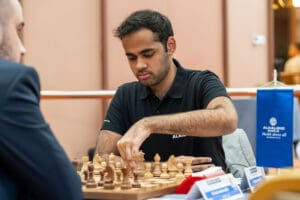 Читамбарам Аравинд (2.711) со црни фигури против Давид Навара (2.656) одлучи да контрира со ризична модерна варијанта на сицилијанската одбрана. Притоа, жртвуваше пешак, потоа уште еден, а во завршницата влезе со голем ризик, но активноста му донесе заслужено реми.