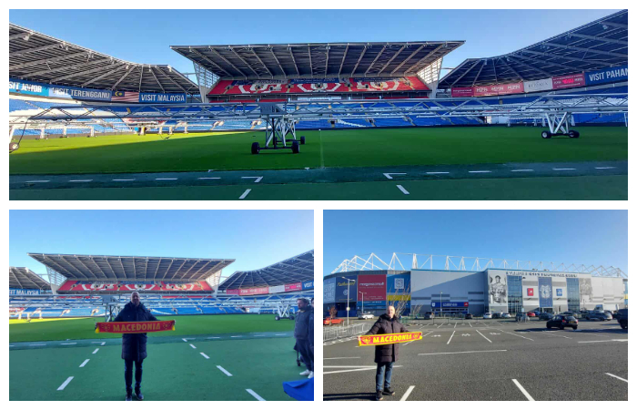 Првиот веќе е таму. Популарниот Кипре, поддржувач на сите македонски национални тимови ги разви „црвено-жолтите“ бои пред стадионот. Атмосферата сигурно ќе биде одлична пред утрешната средба кога ќе доминираат и боите на Македонија.