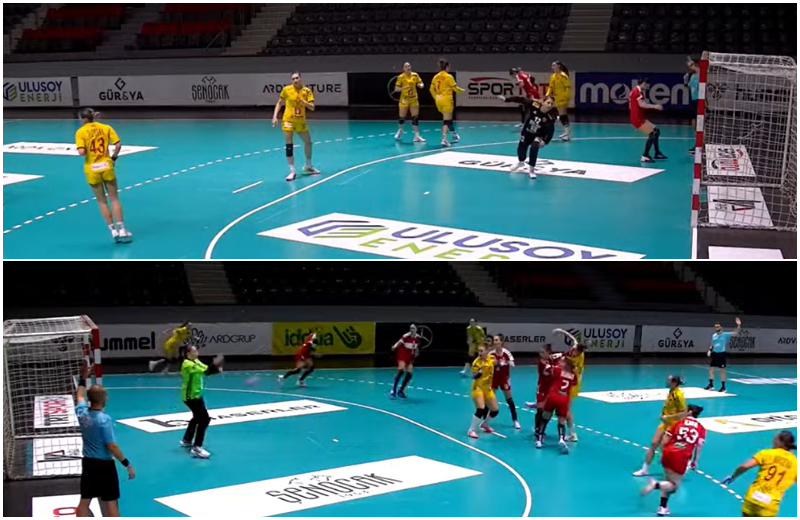Дуелот започна изедначено, со тоа што предноста од еден гол ја имаше Турција. Нашите девојки рпиредија пресврт и во 20-та минута поведоа со 5-6. Нешто подоцна противникот казни неколку наши грешки и поведе со 11-9 во 25 минута. Ова не беше доволно за да се демотивираат „цврено-жолтите“, на одморот изедначија на 12-12.