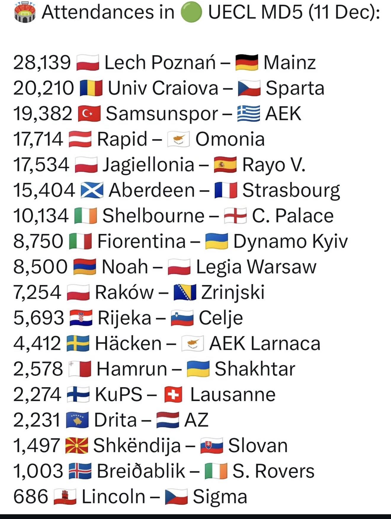 Синоќа само два меча во Европа биле помалку посетени. Тоа е мечот на Исланд помеѓу екипите на Бреидаблик и Сеинт Роверс од Ирска, и дуелот во Линколн од Гибралтар против тимот на Сигма каде што присуствувале за тамошмни услови сосема солидни 686 гледачи.