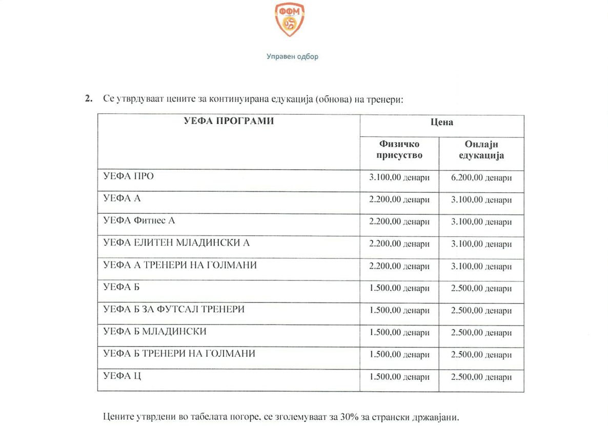 Оваа објава е во согласност со Правилникот на Центарот за едукација на тренери на ФФМ, усвоен од Управниот одбор на ФФМ. Во прилог се доставуваат табела со износите за уплата согласно лиценцата која ја поседувате.