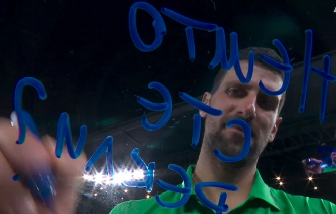 Novak Djokovic wrote “Нешто сте рекли” on the camera lens after defeating Jannik Sinner in the Australian Open.