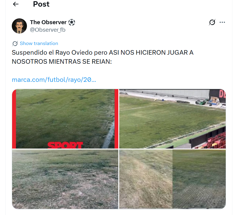 Во својата изјава, Овиедо го поддржа Рајо Ваљекано, кој се согласи да го одложи натпреварот поради лошата состојба на теренот по обилните дождови и бури.