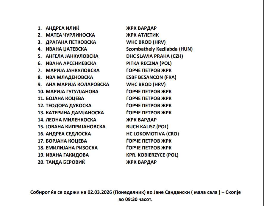 Предводникот на нашиот најдобар национален тим се одлучи за 20 ракометарки. Првиот собир е закажан за во понеделник во малата сала во „Јане Сандански“. Македонија во овие квалификации нема победа, запиша два порази.