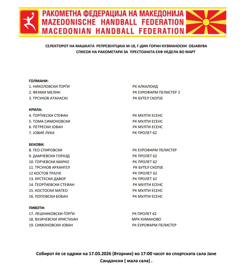 Во очекувањ ена претстојната ЕХФ недела, селекторот на нашата ракометна репрезентација до 18 години, Горан Кузманоски, го објави списокот на повикани ракометари.
