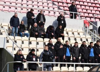 Раководството на Шкендија во пресрет на почетокот на средбата со Вардар и тоа како се “ПОКАЖА“. Имено како што може да се види од фотографијата, претставниците на тетовскиот клуб на чело со директорот на клубот Ардијан Цуцули не стоеја...
